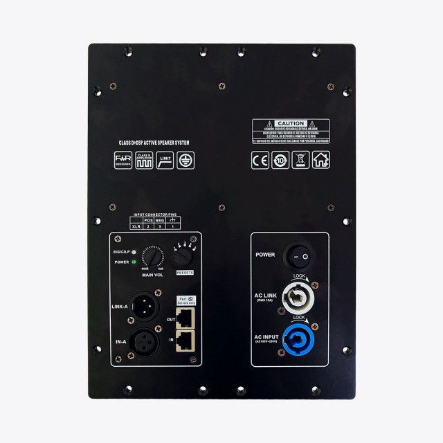 - Professional-grade audio class D amplifier circuit, Bi-AMP design, RS485 networking.